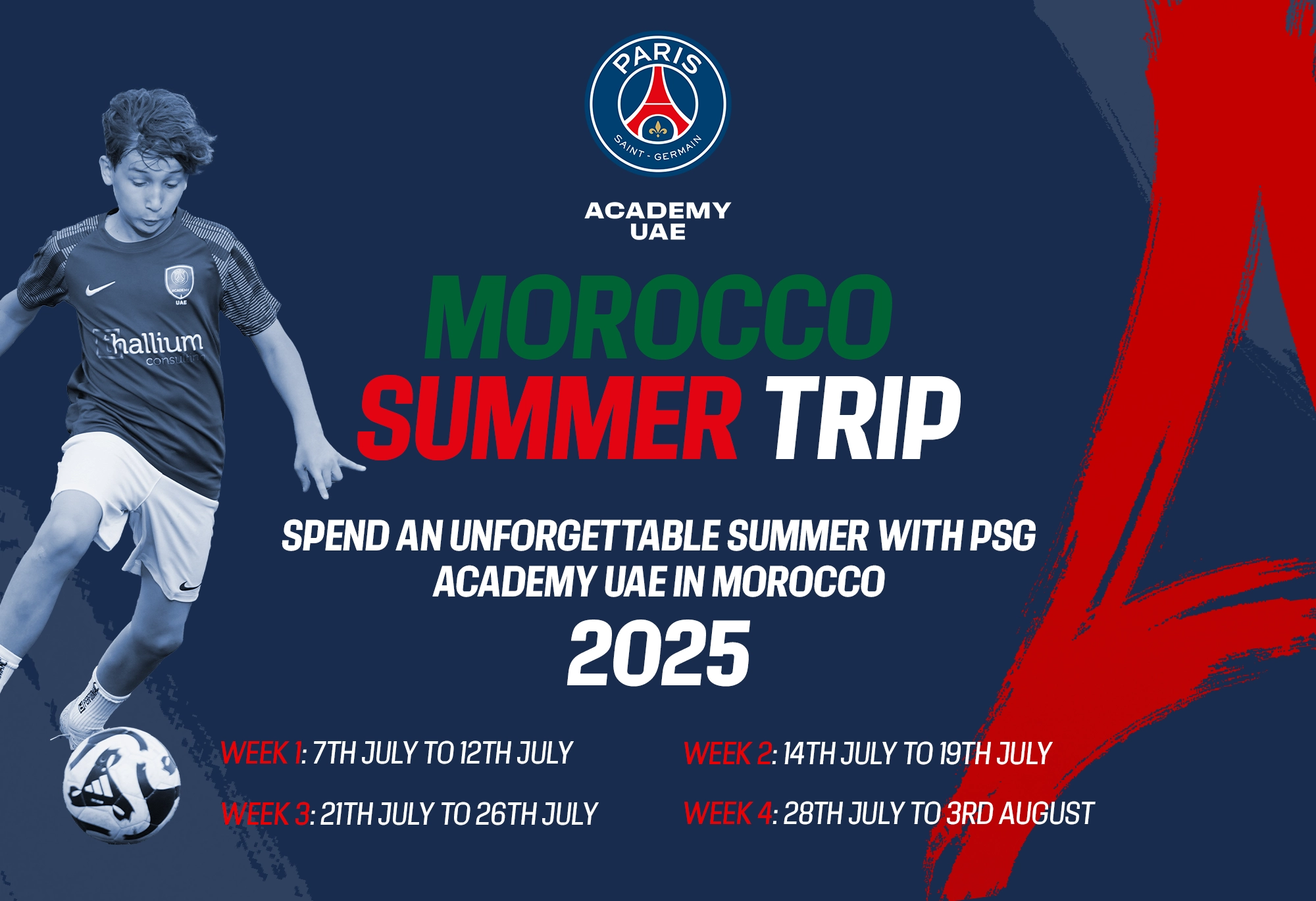 This year, PSG Academy KSA is bringing players to Rabat for an incredible 4-week summer experience! Join us for a week filled with football, fun, and friendship as you train with fellow enthusiasts from around the world. This is your chance to develop new skills, explore new horizons, and make lasting memories.